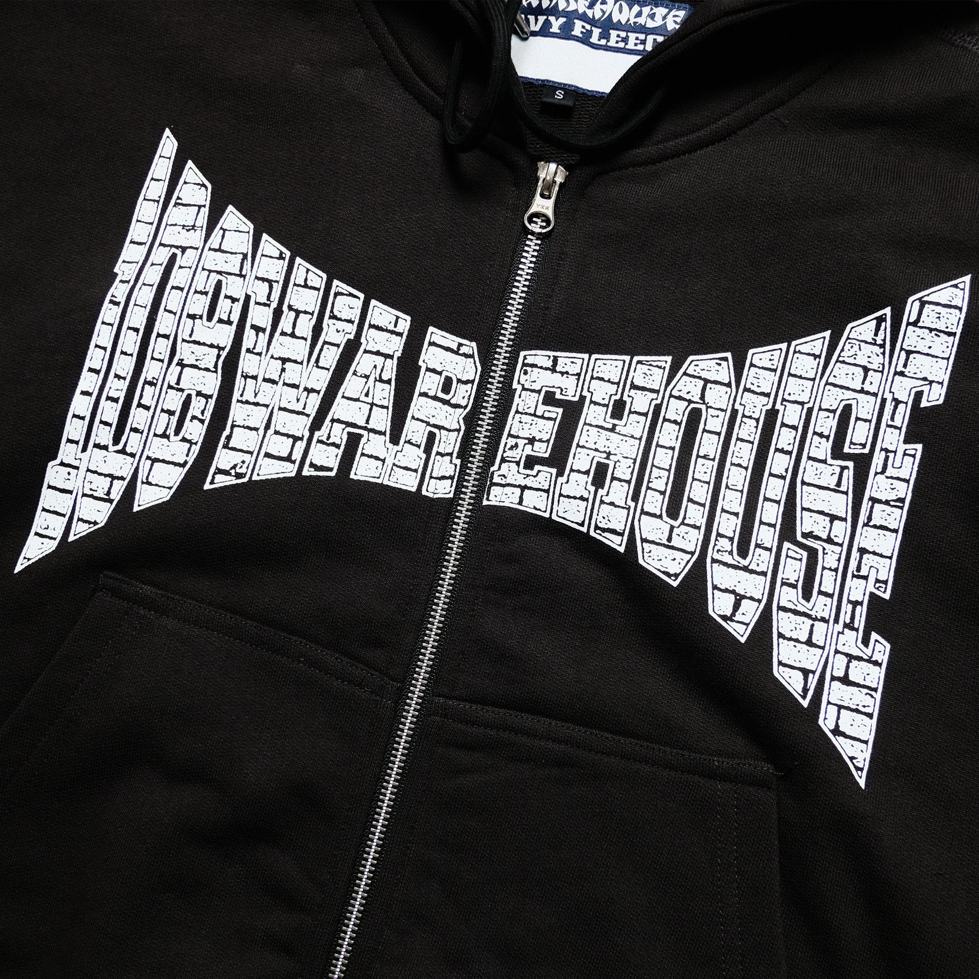 - 108WAREHOUSE woven tag on the interior neck and right side kangaroo pocket.