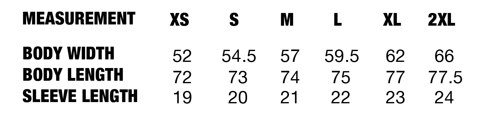 | Measurements (CM) | Body Width | Body Length | Sleeve Length |