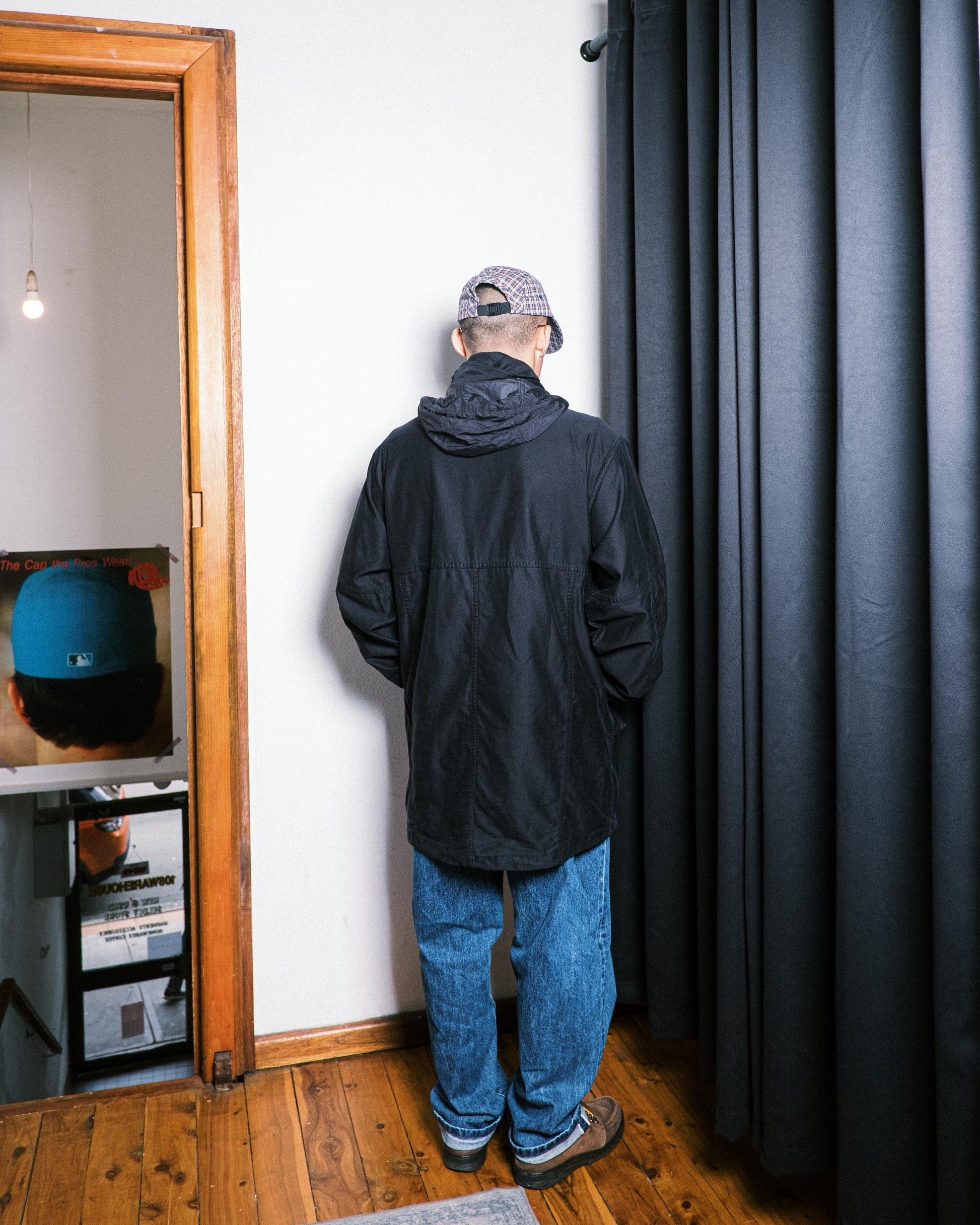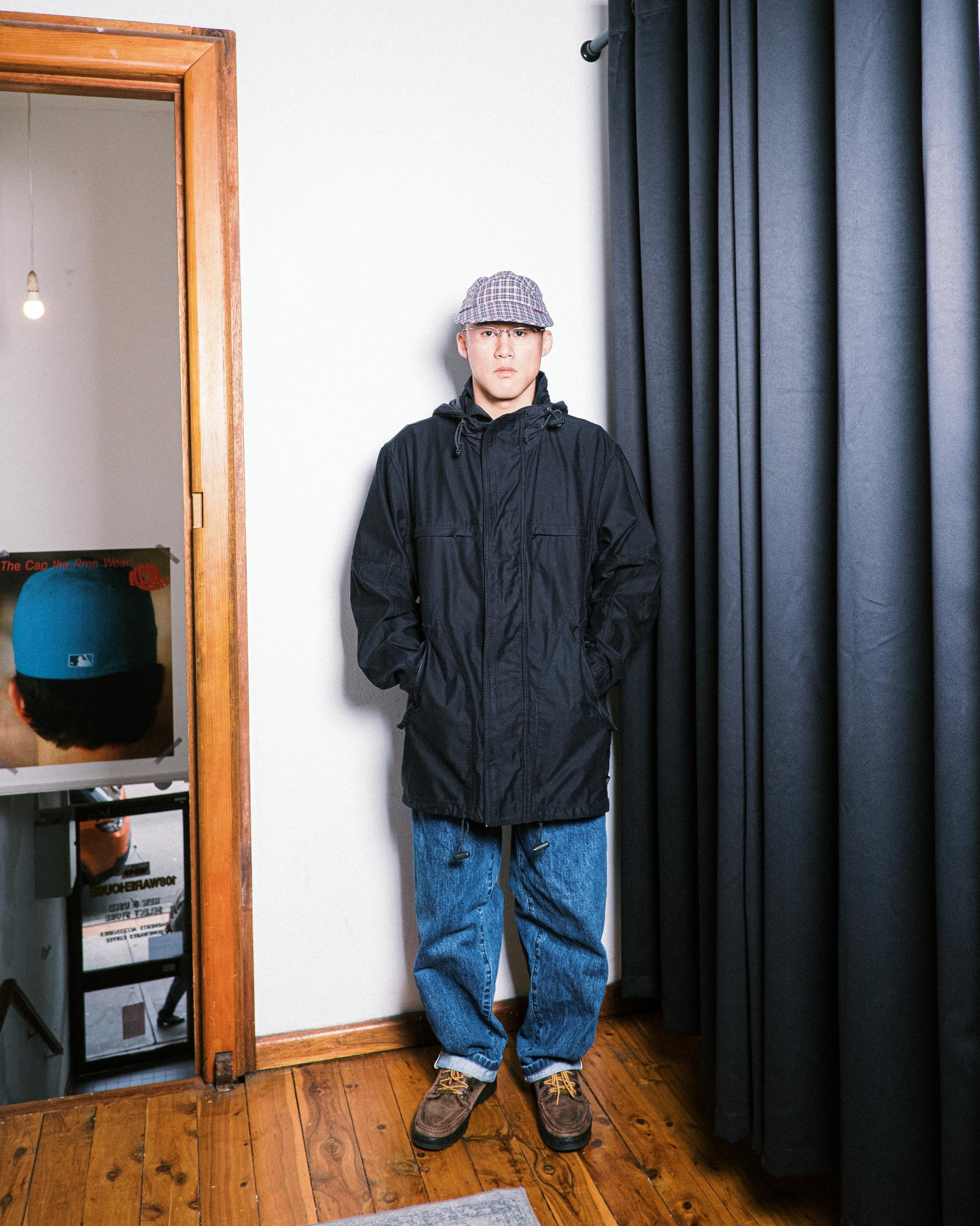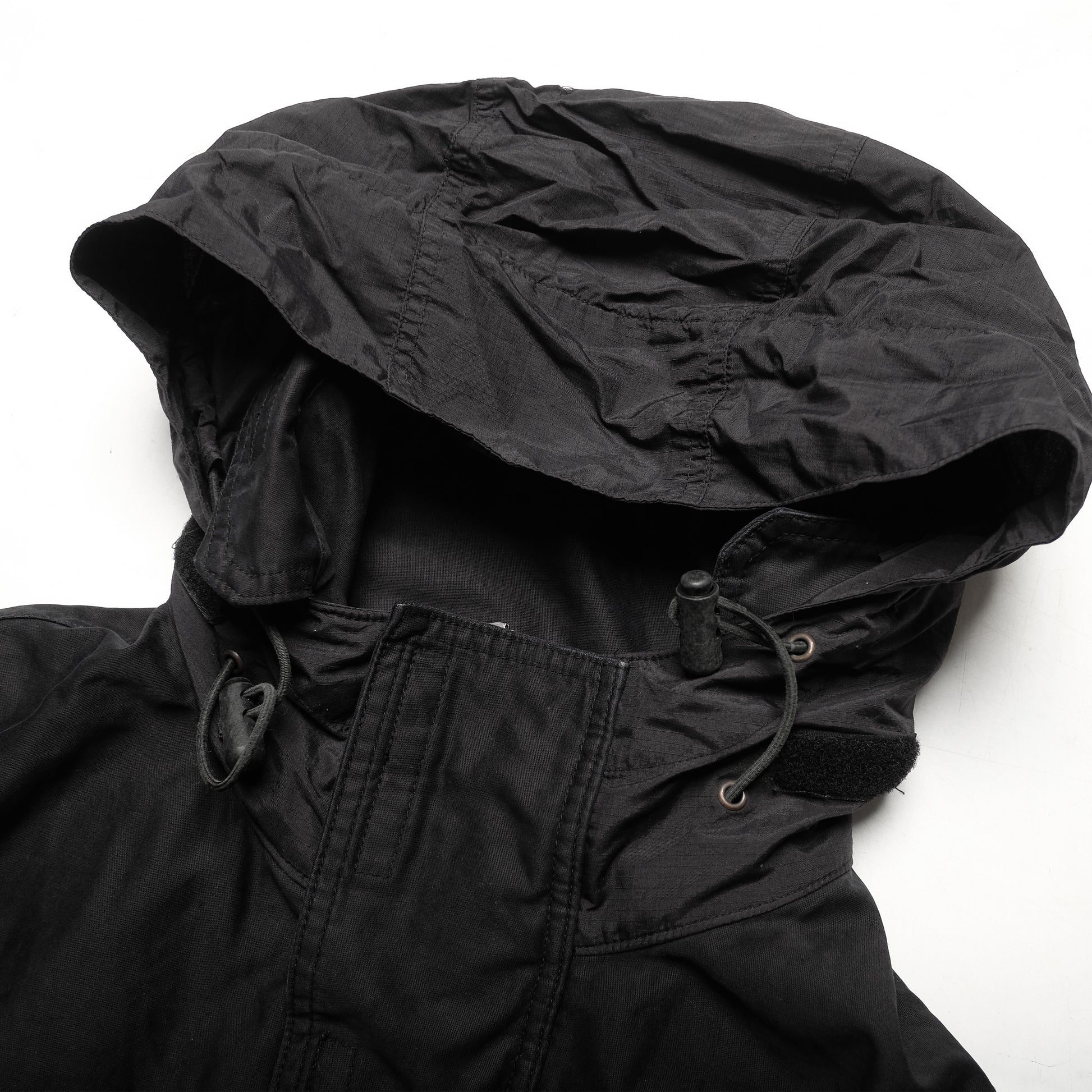 - Stashable hood with elastic toggles